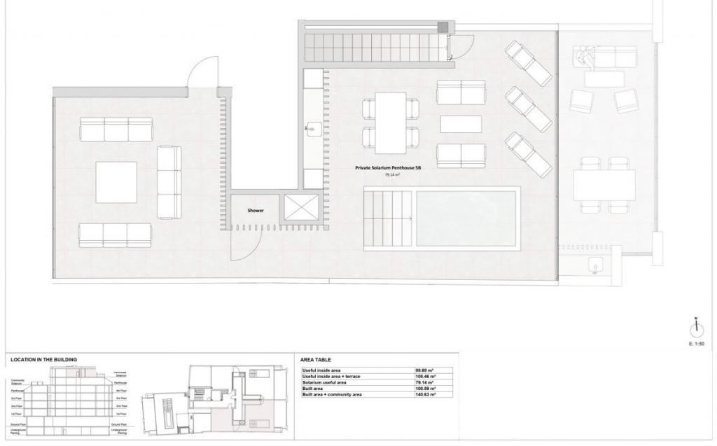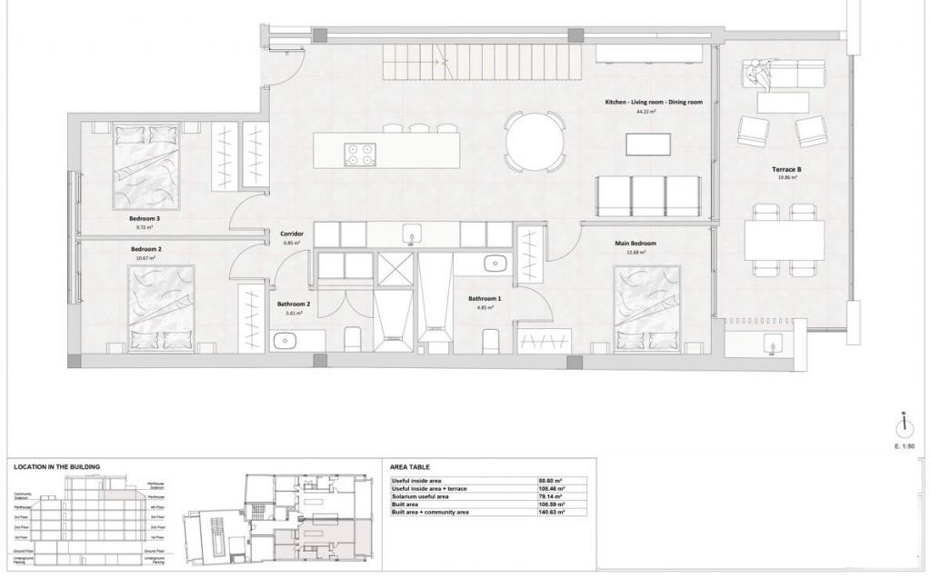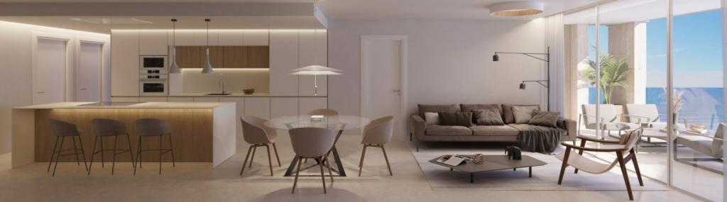 Apartamentele au 3 dormitoare și 2 băi, bucătărie deschisă cu zona de lounge, dulapuri încorporate și oferă vedere directă spre piața orașului, plajă și mare. Penthouse-urile au acces direct la propria terasă privată de 80 m2, cu vedere panoramică.