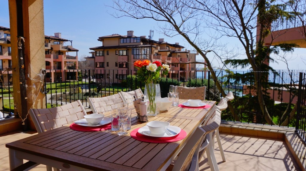 Terasa generoasă cu vedere la mare: În timp ce soarele strălucește pe cerul senin al Bulgariei, vă puteți relaxa și admira priveliștea uimitoare a mării de pe terasa generoasă a acestui apartament. Este locul perfect pentru a savura o cafea dimineața sau pentru a petrece seri romantice cu apusuri de neuitat.