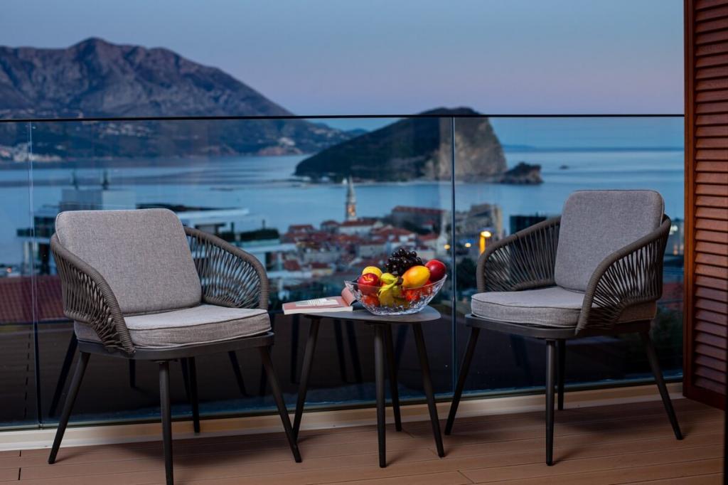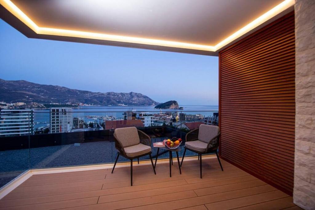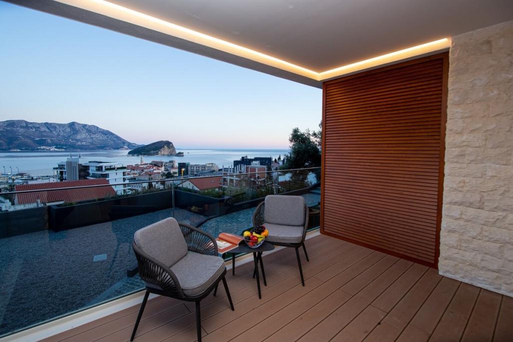 Locația uimitoare oferă intimitate rezidenților săi, iar în același timp, este aproape de centrul Budvei și oferă o vedere uimitoare la mare, întregul golf Budva și orașul vechi Budva cu o vechime de 2,5 milenii.