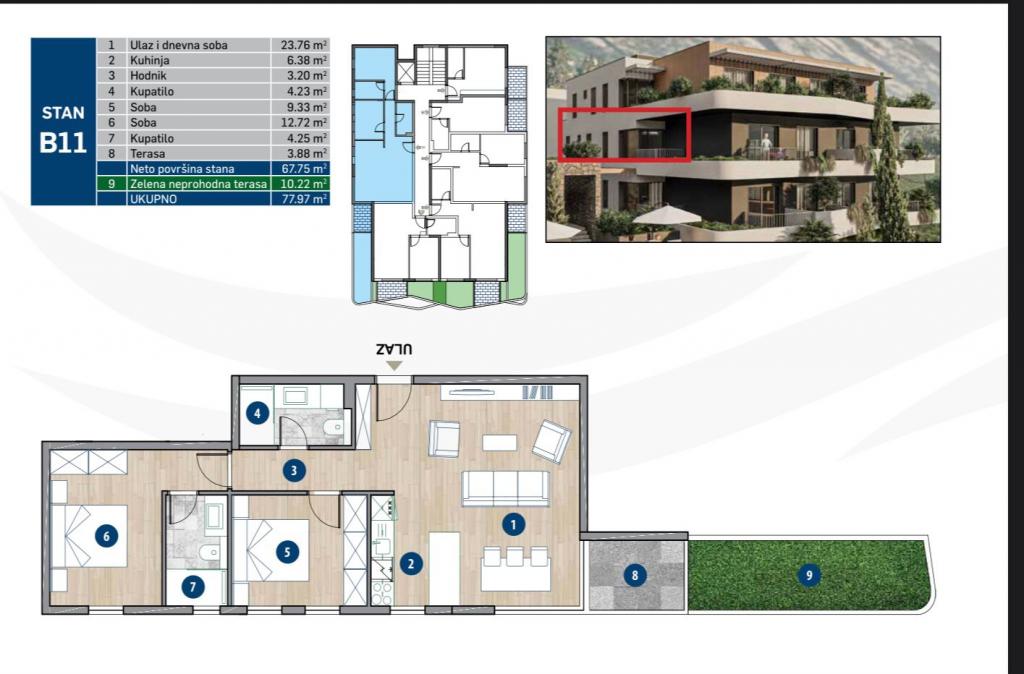 3. Sustenabilitatea energetică garantează confortul șederii în apartament, costurile mai mici de încălzire și răcire, adică eficiența energetică. Proprietățile energetice ale clădirii îndeplinesc standardele stricte ale UE. Planele fațadei sunt izolate cu polistiren grafit de 8 cm grosime. Fiecare apartament este echipat cu un sistem central de încălzire și răcire, are și un sistem de ventilație care asigură o calitate constantă a aerului în interior, fără umiditate și alergeni, iar în același timp se obțin economii la consumul de energie. Estetica clădirii condiționată de tipologia rezidențială, forma terenului și locația în sine sunt accentuate suplimentar de materialele aplicate pe fațada clădirii.
