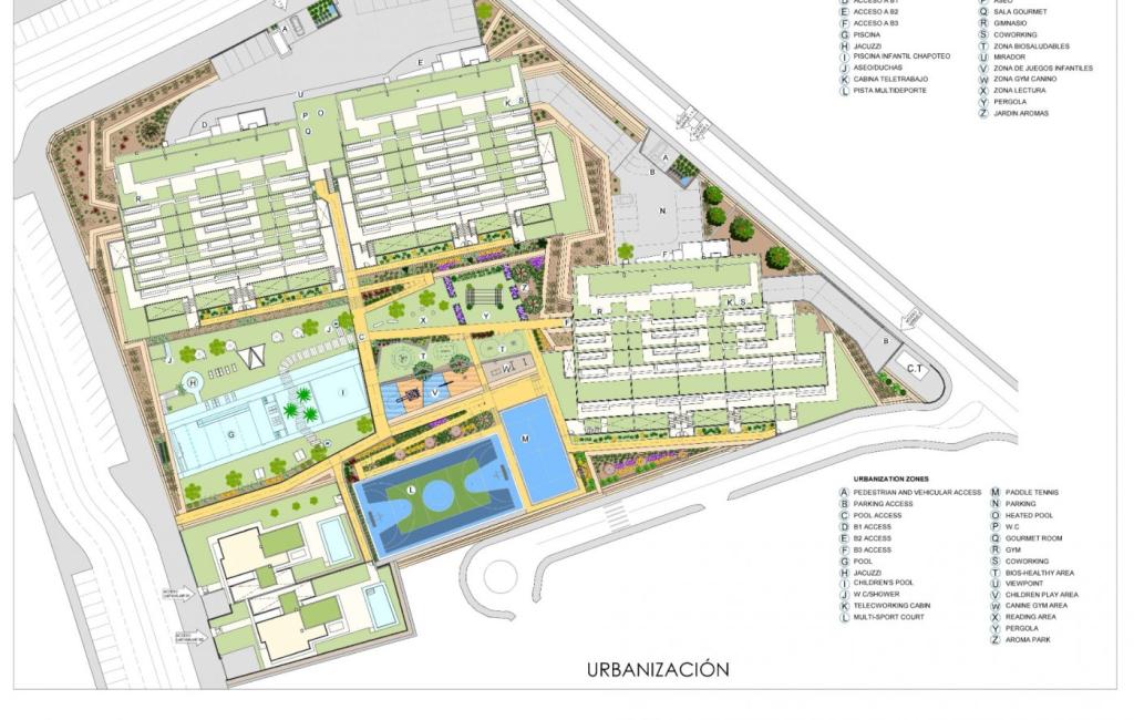 Complexul este închis și oferă o serie de facilități comune, precum o piscină comunitară de 200 m², o piscină interioară încălzită, un loc de joacă pentru copii, o zonă sportivă cu teren de padel, parcare subterană, depozit și lift.
