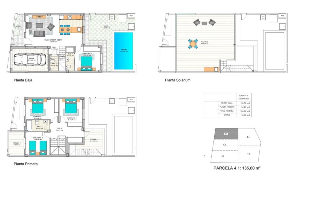 Complexul de lux nou construit constă în 5 proprietăți (3 case de oraș și 2 vile) cu piscină privată, garaj cu poartă, curte interioară, solar cu bucătărie de vară și preinstalare pentru încărcarea vehiculelor electrice. Fiecare proprietate are 4 dormitoare și 3 băi, cu o alegere de 3 dormitoare mai mari, proiectate cu interioare elegante și funcționale, bucătării complet utilate, inclusiv electrocasnice. Dormitoarele includ dulapuri căptușite cu sertare și au, de asemenea, preinstalare pentru aer condiționat prin conducte.