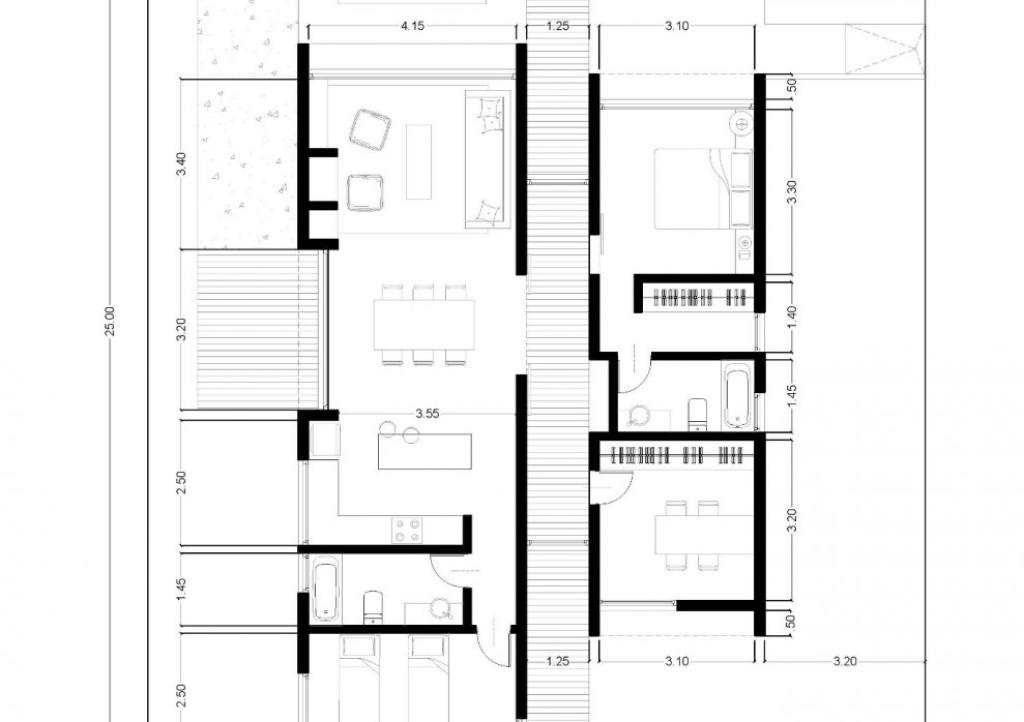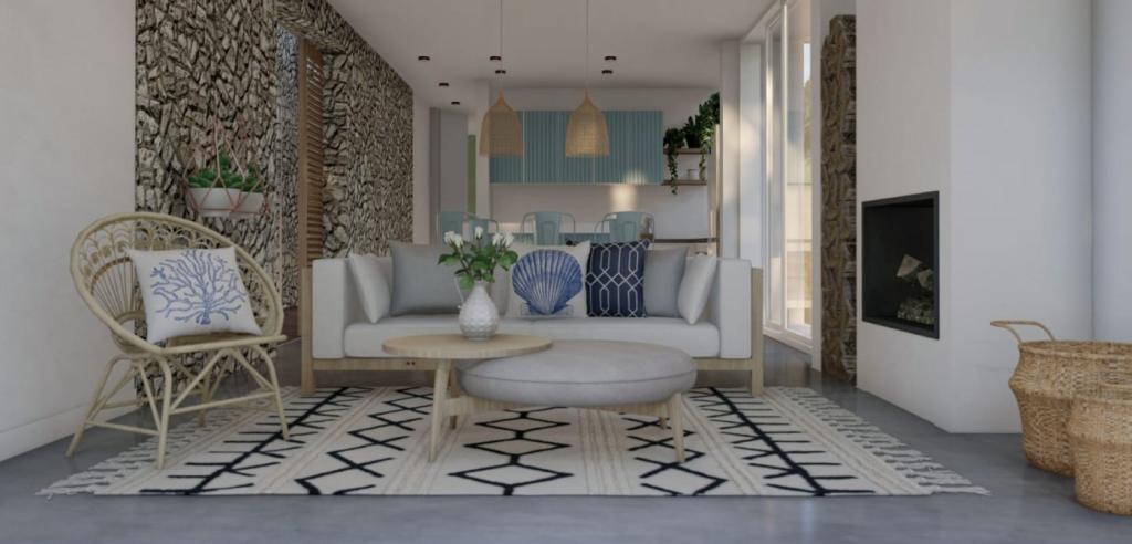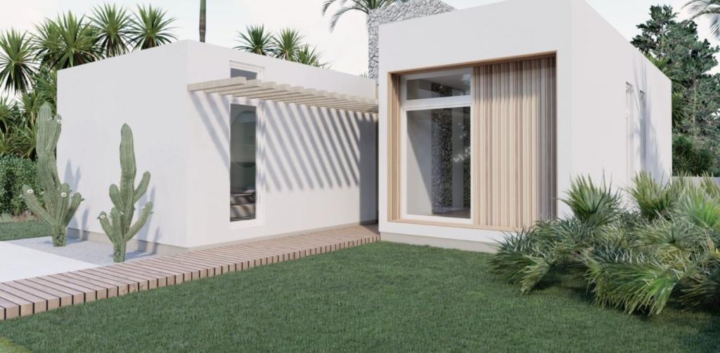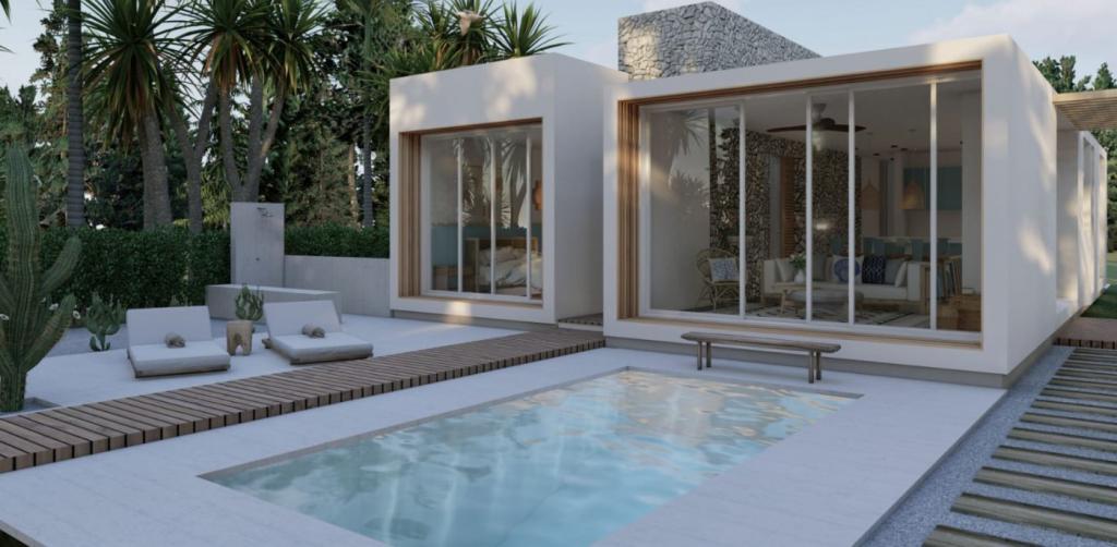Stilul vilișorului este împărțit în 2 cuburi albe, cu pereți din piatră naturală.