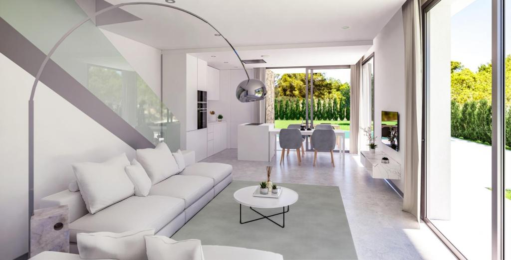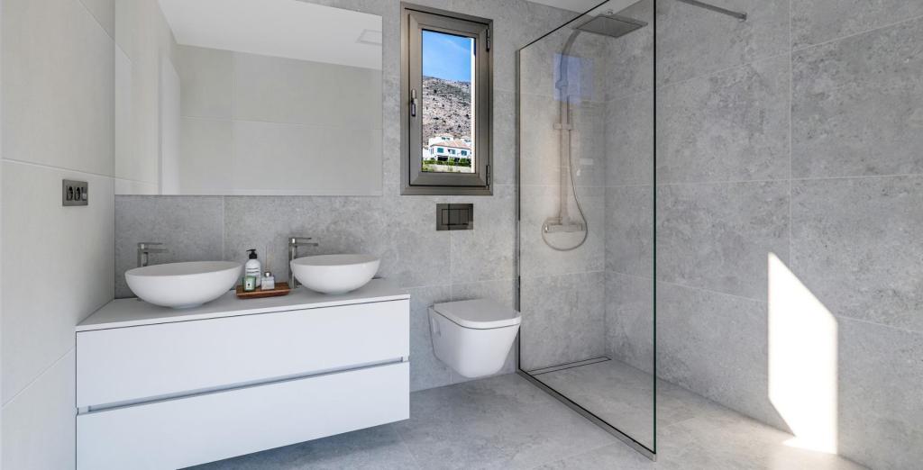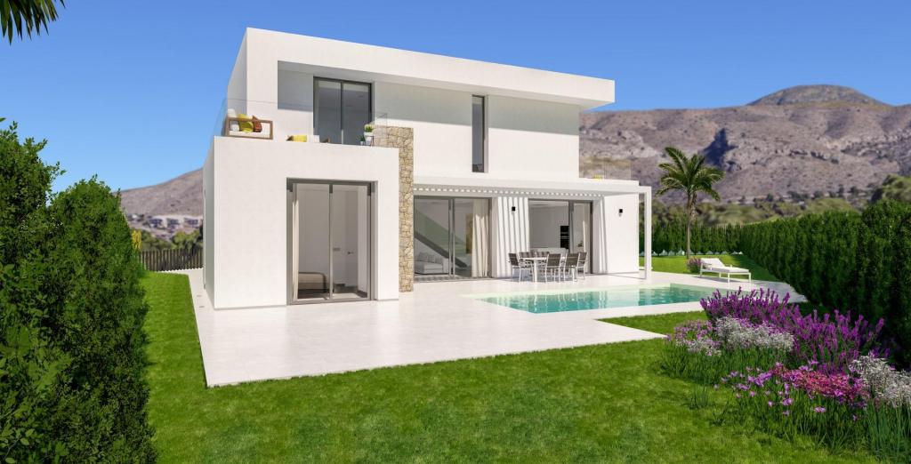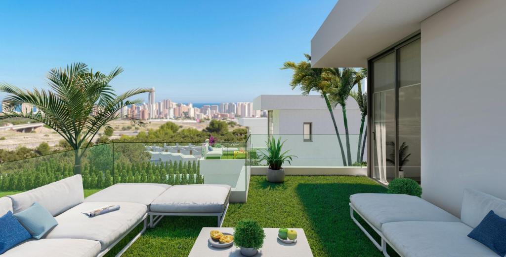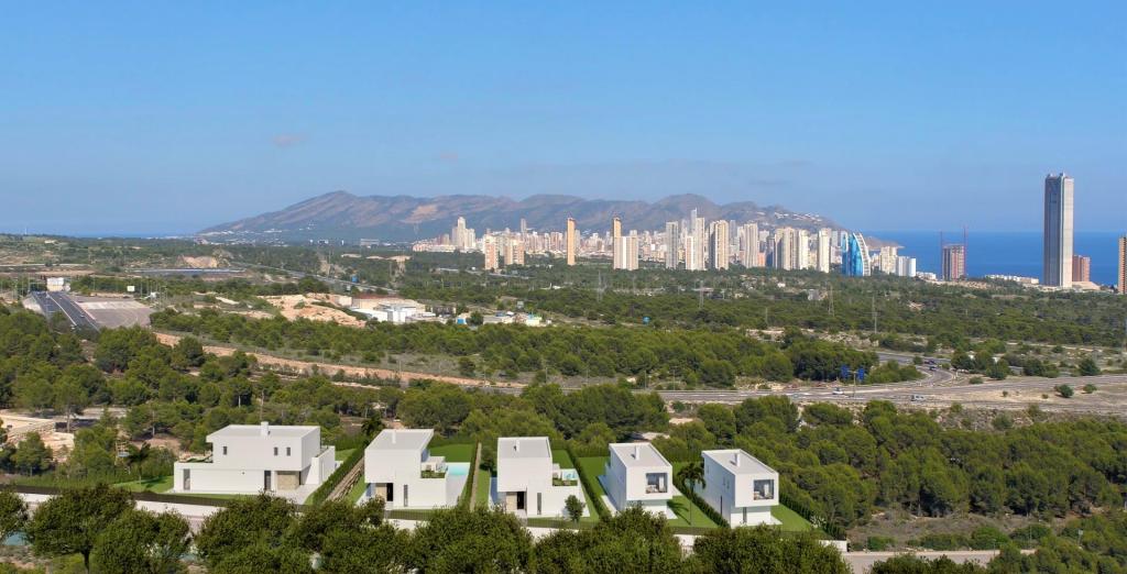 Vile cu 3 dormitoare si 3 bai, bucatarie deschisa cu zona de lounge, terasa cu vedere magnifica spre Benidorm, gradina privata cu piscina si loc de parcare.