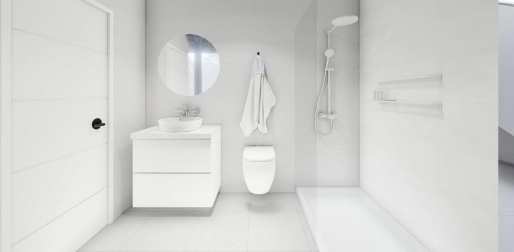 Băi complet utilate cu toaletă suspendată, ecran de duș, unitate de toaletă, oglindă cu lumină și duș cu ploaie.